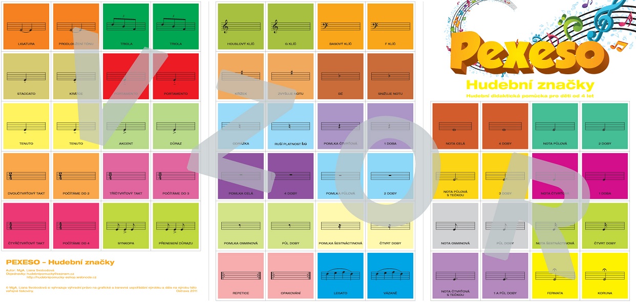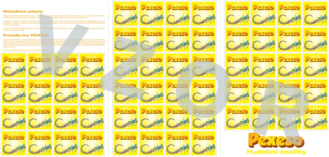 Hudební didaktická pomůcka Pexeso – Hudební značky je určena dětem od 4 let a má hravou formou pomoci všem dětem zvládnout základní (elementární) hudební značky, se kterými se setkávají při svých prvních hudebních krůčcích.